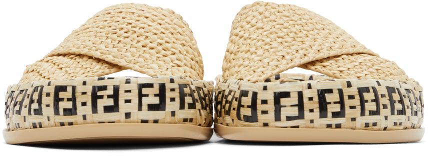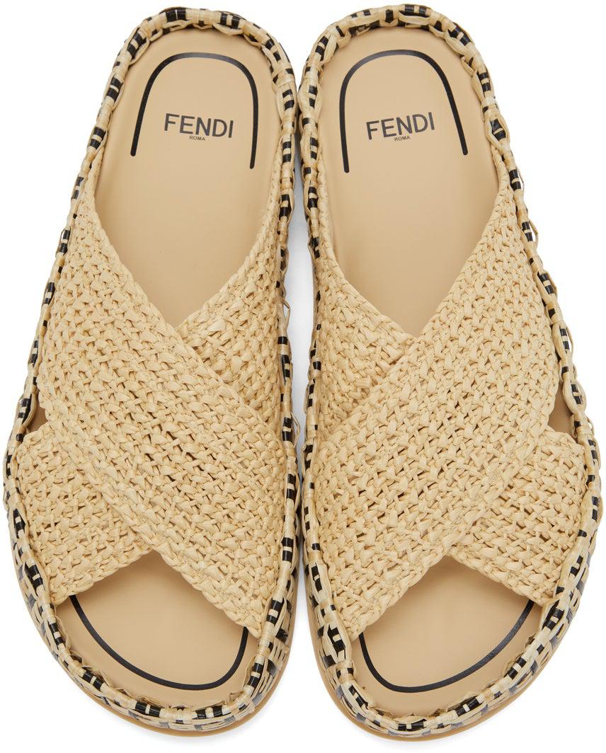 Woven raffia sandals in beige. Open round toe. Logo printed in black at tan faux-leather footbed. Logo woven in black at beige raffia midsole. Rubber outsole in beige. Supplier color: Beige Upper: textile, synthetic. Sole: rubber. Brand: Fendi