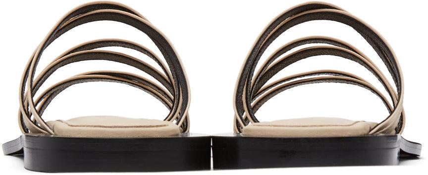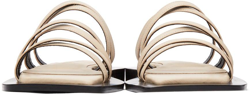Buffed leather slip-on sandals in beige. Open square toe. Crisscrossing straps at vamp. Logo embossed at tonal leather footbed. Rubber sole in black. Supplier color: Ivory Upper: leather. Sole: rubber. Brand: Flat Apartment