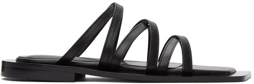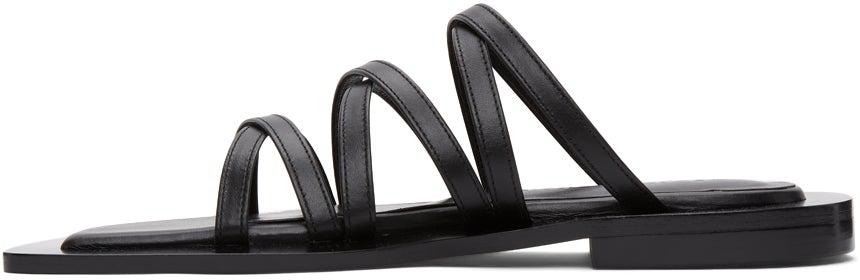 Buffed leather slip-on sandals in black. Open square toe. Crisscrossing straps at vamp. Logo embossed at tonal leather footbed. Tonal rubber sole. Supplier color: Black Upper: leather. Sole: rubber. Brand: Flat Apartment