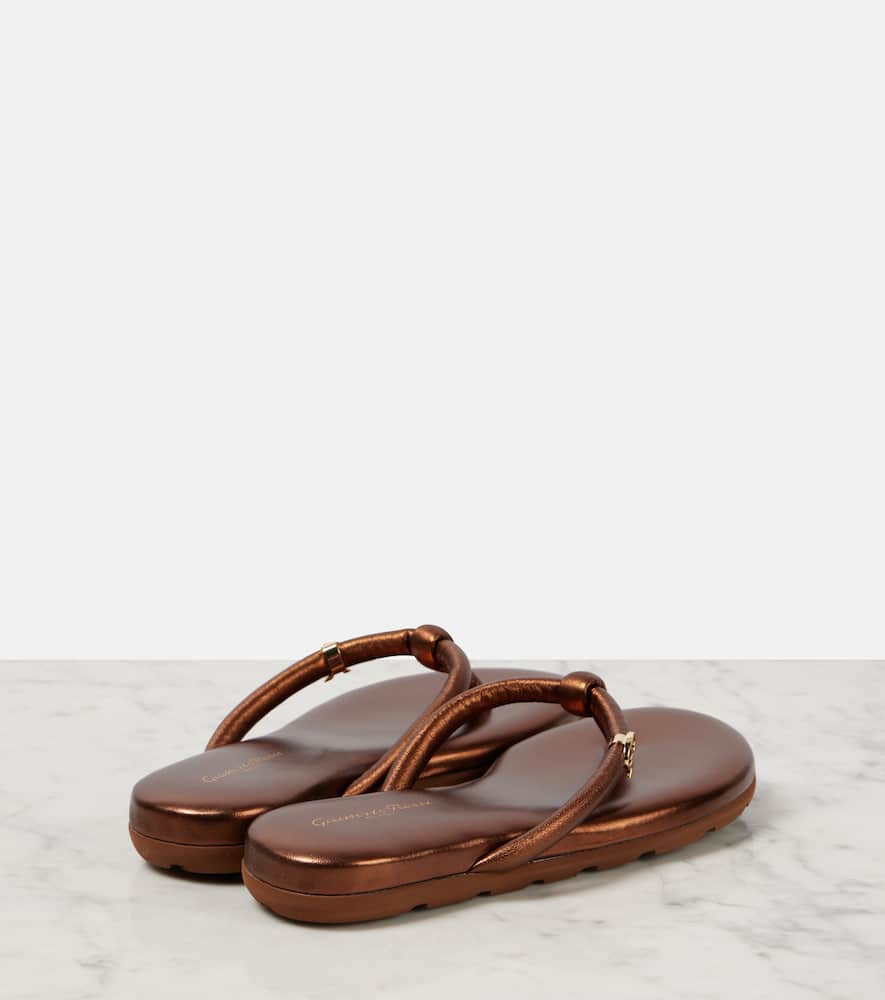 Upper: leather. Lining: leather. Sole: leather insole, rubber sole. Toe shape: round open toe. Made in Italy. Includes: shoe box, dust bag. Designer color name: Chocolate. Hardware color: gold. Shop the latest Gianvito Rossi Flat Sandals for women now.