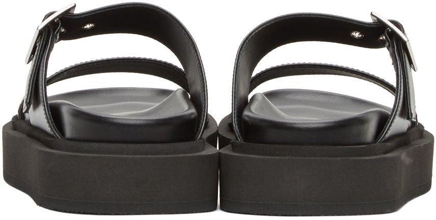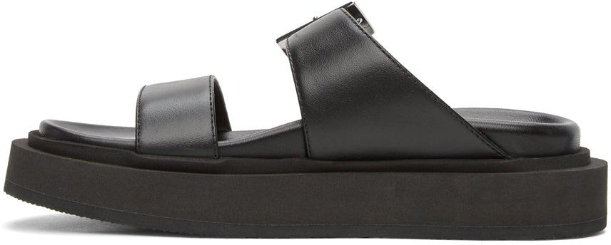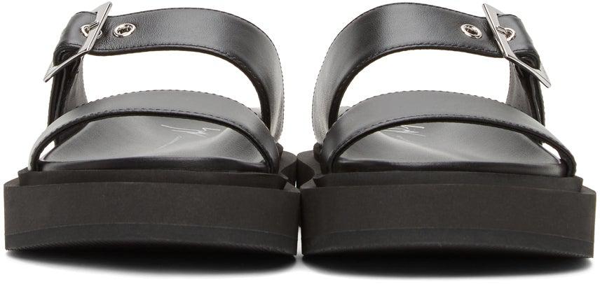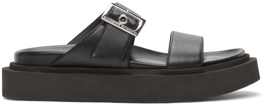 Buffed leather slip-on sandals in black. Open round toe. Adjustable strap with pin-buckle fastening at vamp. Silver-tone logo stamp at molded leather footbed. Tonal platform foam rubber midsole. Tonal treaded rubber outsole. Logo-engraved silver-tone hardware. Approx. 1.5 platform. Supplier color: Black Upper: leather. Sole: rubber. Brand: Giuseppe Zanotti
