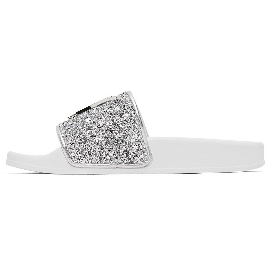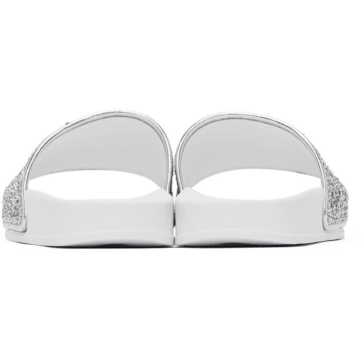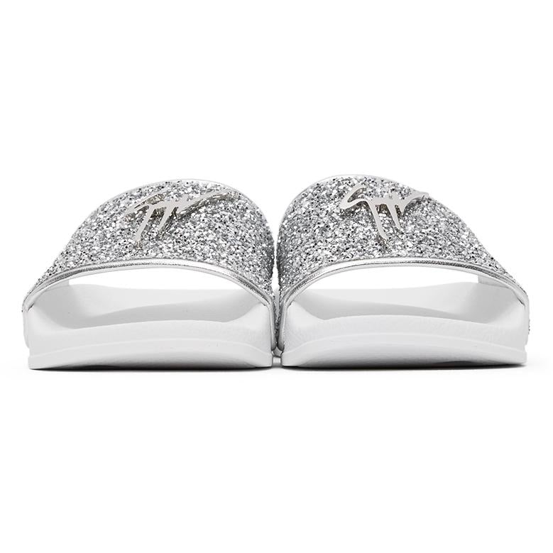 Glittered textile slip-on sandals in metallic silver-tone. Open round toe. Logo hardware at vamp. Logo embossed at white textured rubber footbed. Textured rubber midsole in white. Treaded rubber outsole in white. Silver-tone hardware. Supplier color: Silver Upper: textile, leather. Sole: rubber. Brand: Giuseppe Zanotti