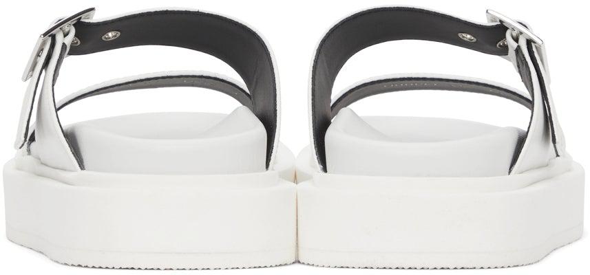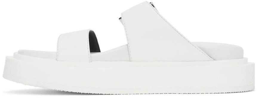 Buffed leather slip-on sandals in white. Open round toe. Adjustable strap with pin-buckle fastening at vamp. Silver-tone logo stamp at molded leather footbed. Tonal platform foam rubber midsole. Tonal treaded rubber outsole. Logo-engraved silver-tone hardware. Approx. 1.5 platform. Supplier color: White Upper: leather. Sole: rubber. Brand: Giuseppe Zanotti