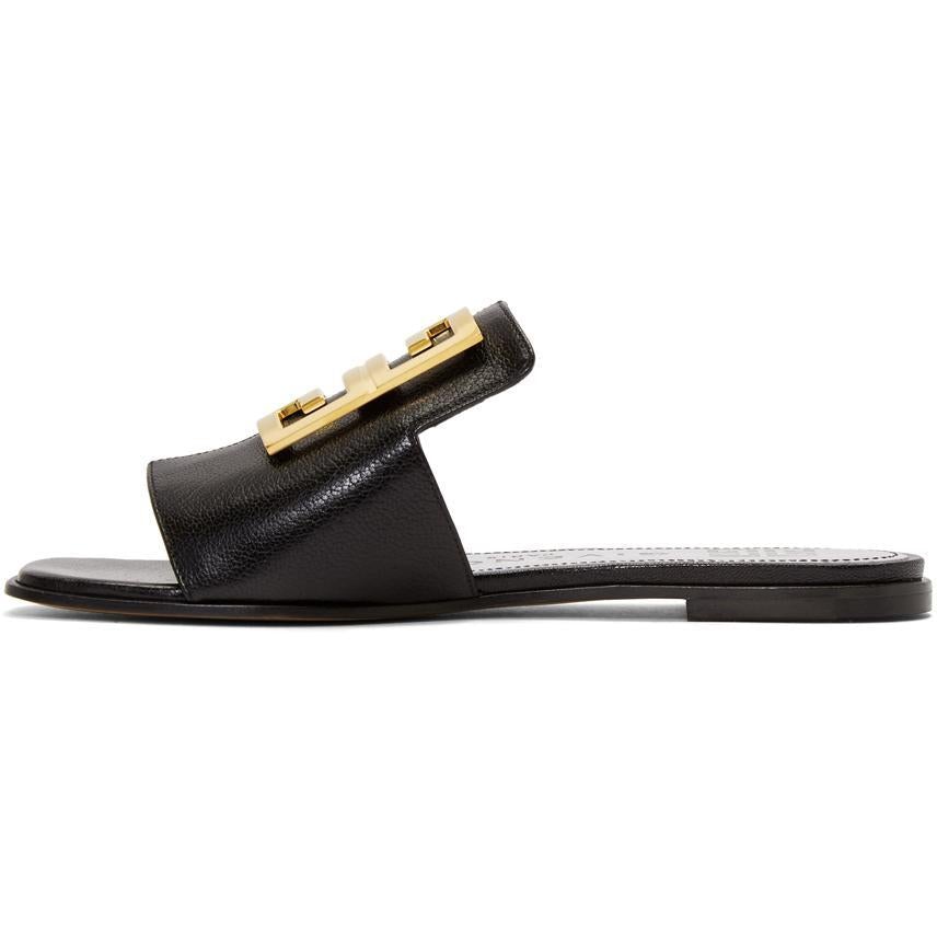 Grained goatskin sandals in black. Open square toe. Logo hardware at face. Leather sole in tan featuring rubber injection at heel. Gold-tone hardware. Supplier color: Black Goatskin. Brand: Givenchy