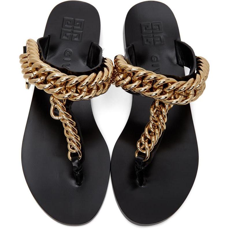 Polished leather slip-on sandals in black. Open round toe. Chain link detailing at vamp. Logo medallion at outer side. Logo embossed at tonal leather footbed. Tonal buffed leather lining. Tonal stacked leather midsole. Tonal leather outsole. Gold-tone hardware. Supplier color: Black Upper: leather, metal. Sole: leather. Brand: Givenchy