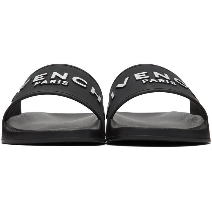 Rubber slip-on sandals in black. Open round toe. Logo debossed in white at strap. Molded rubber footbed. Treaded tonal rubber sole featuring debossed logo at outer side. Supplier color: Black Rubber. Brand: Givenchy