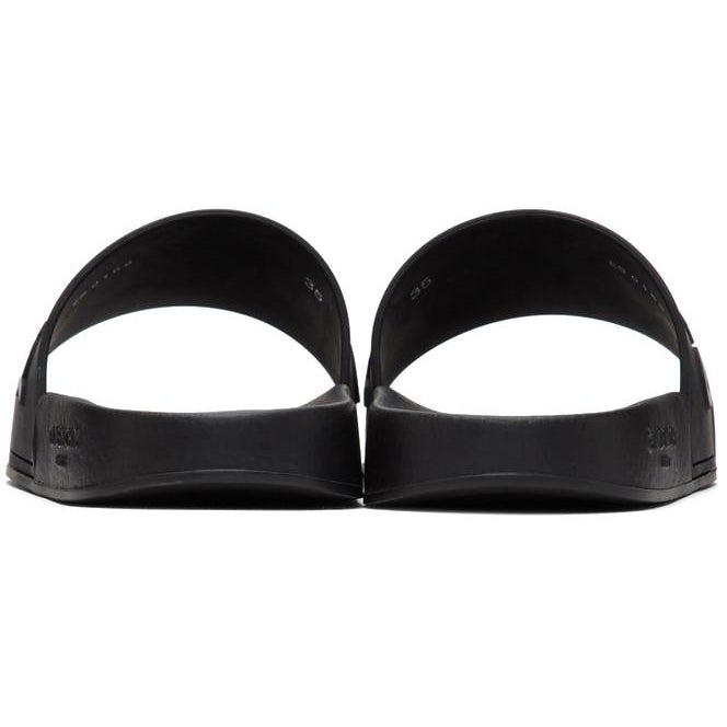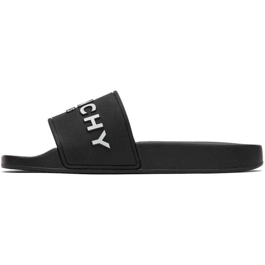 Rubber slip-on sandals in black. Open round toe. Logo debossed in white at strap. Molded rubber footbed. Treaded tonal rubber sole featuring debossed logo at outer side. Supplier color: Black Rubber. Brand: Givenchy
