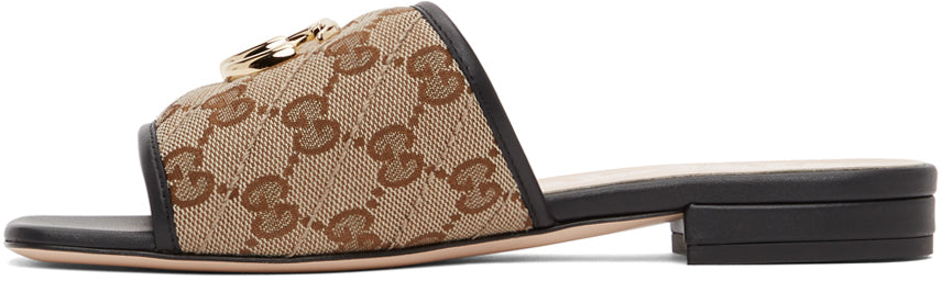Quilted canvas slip-on sandals in beige featuring logo pattern woven in brown. Open square toe. Buffed leather trim in black and logo hardware at vamp. Logo stamp in gold-tone at buffed leather footbed in pink. Buffed leather lining in pink. Leather midsole in black. Leather outsole in pink with rubber injection at heel. Gold-tone hardware. Supplier color: Beige/Black Upper: textile. Sole: leather. Brand: Gucci