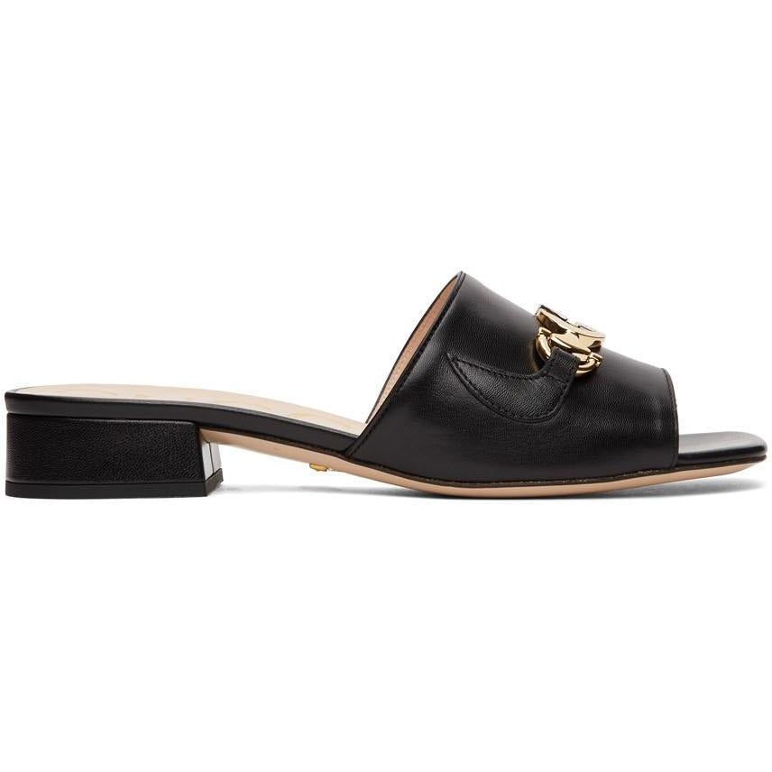 Buffed kidskin slip-on sandals in black. Open square toe. Signature interlocking G horsebit logo hardware at vamp. Gold-tone logo stamp at pink leather footbed. Tonal covered block heel. Leather sole in pink. Gold and silver-tone hardware. Approx. 1.5 heel. Supplier color: Black Leather. Brand: Gucci