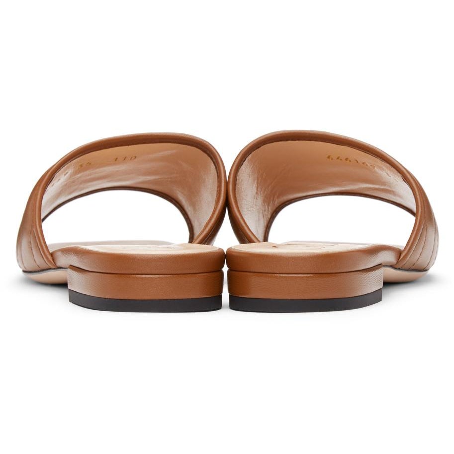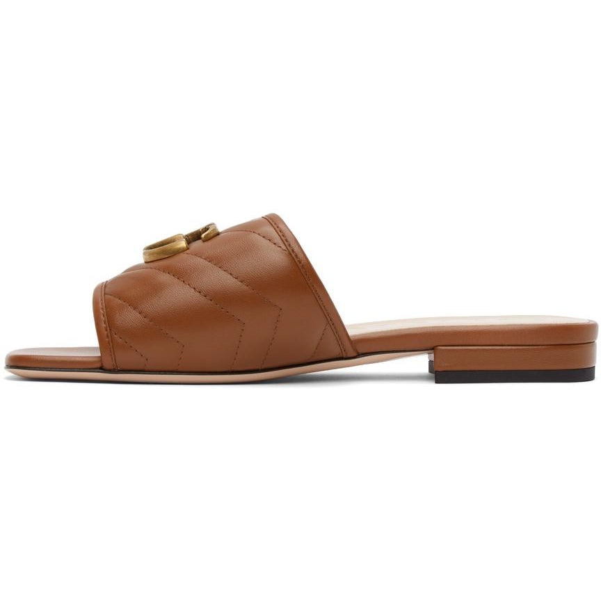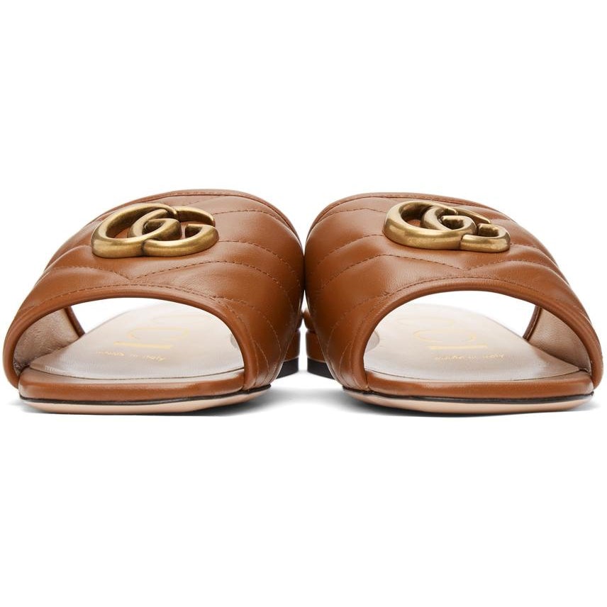 Quilted buffed leather sandals in brown. Open square toe. Logo hardware at strap. Logo embossed in gold-tone at leather footbed. Leather outsole in beige with rubber injection at heel. Antiqued gold-tone hardware. Supplier color: Brown Upper: leather. Sole: leather, rubber. Brand: Gucci