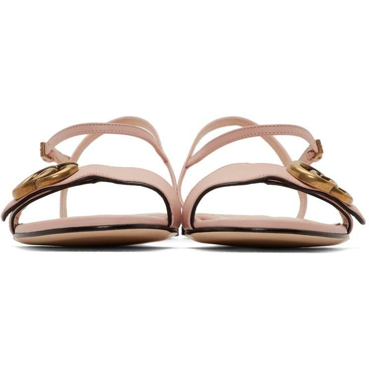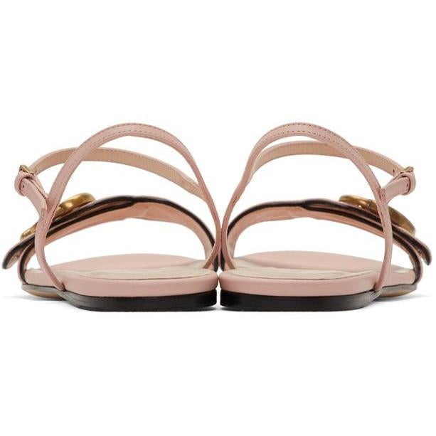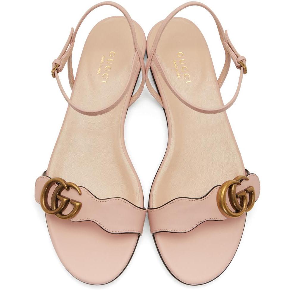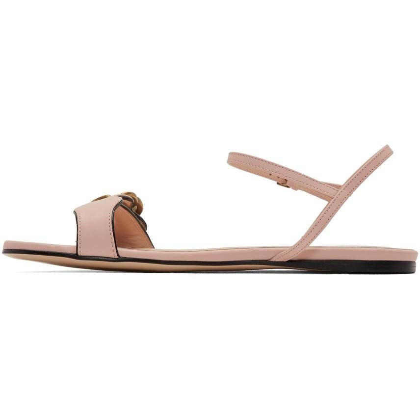 Buffed leather sandals in pink. Burnished edges in black throughout. Open round toe. Logo hardware at strap. Adjustable ankle-strap with pin-buckle fastening. Logo stamp in gold-tone at beige leather footbed. Leather sole in beige. Antiqued gold-tone hardware. Supplier color: Perfect pink Upper: leather. Sole: leather. Brand: Gucci