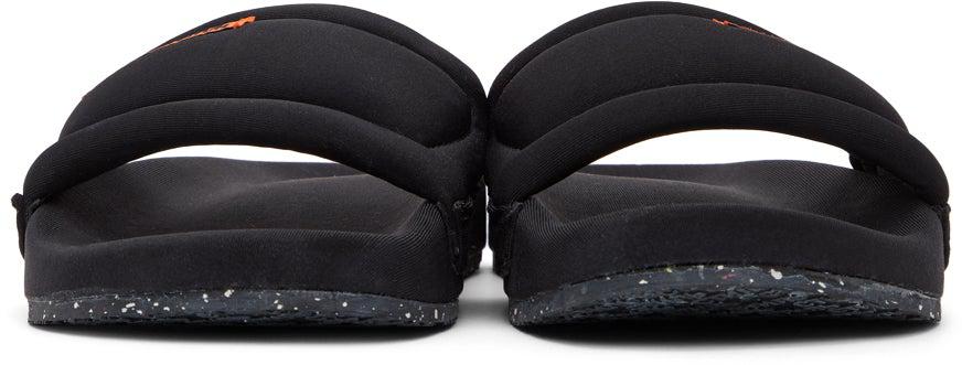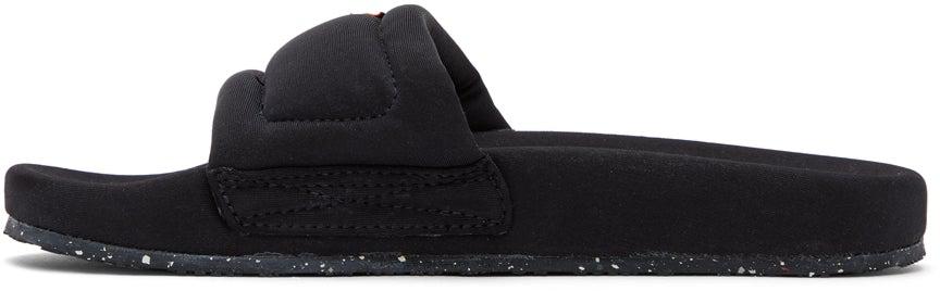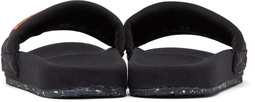 Jersey slip-on sandals in black. Open round toe. Textile logo patch in orange at strap. Molded footbed. Rubber midsole in multicolor. Embossed logo at treaded rubber sole. Supplier color: Black Upper: textile. Sole: rubber. Brand: Heron Preston