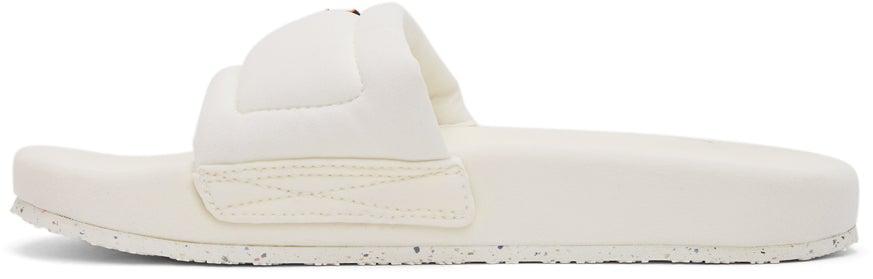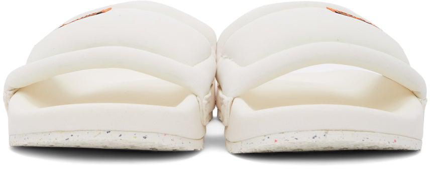 Nylon jersey slip-on sandals in off-white. Open round toe. Padded strap with textile logo patch in orange at vamp. Molded nylon jersey-covered footbed. Tonal treaded rubber outsole. Supplier color: Cream Upper: textile. Sole: rubber. Brand: Heron Preston