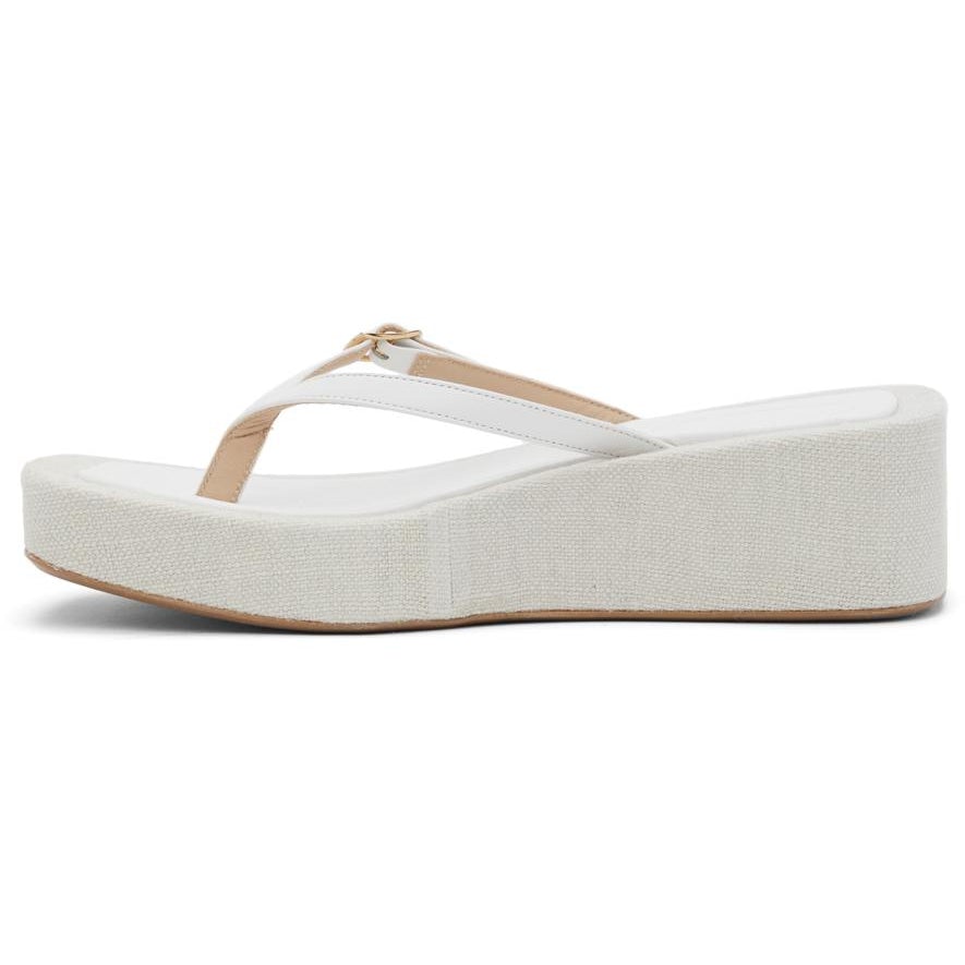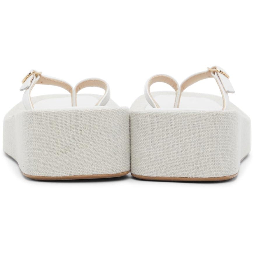 Buffed leather sandals in white. Tonal thong-style strap with adjustable pin-buckle fastening at vamp. Logo embossed at footbed. Recycled canvas-covered platform midsole in beige. Rubber outsole in brown. Gold-tone hardware. Approx. 2 platform. Supplier color: White Upper: leather. Sole: recycled textile, rubber. Brand: Jacquemus