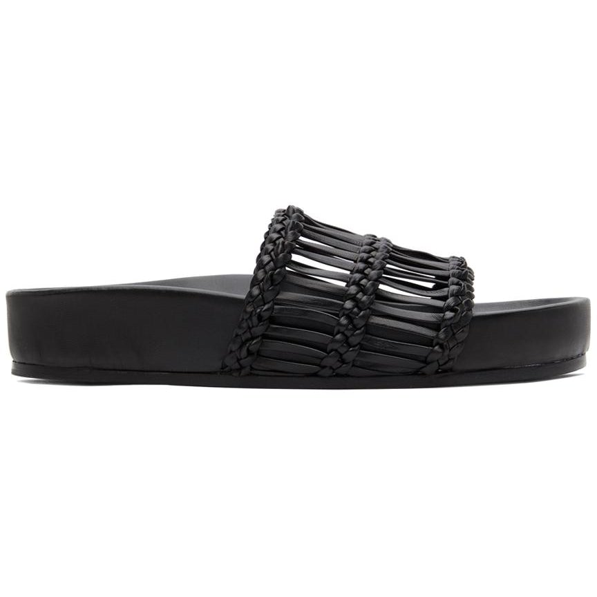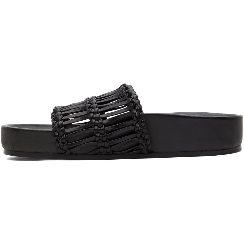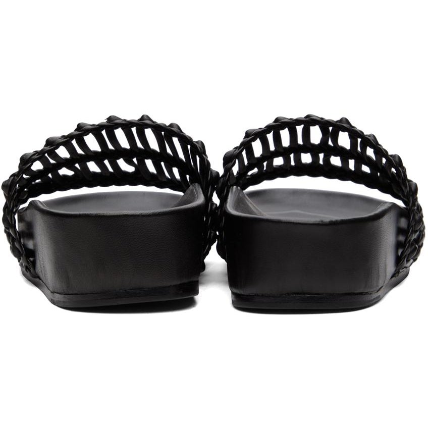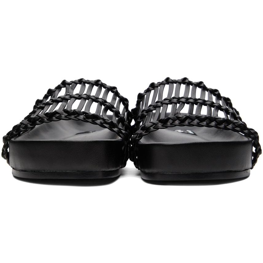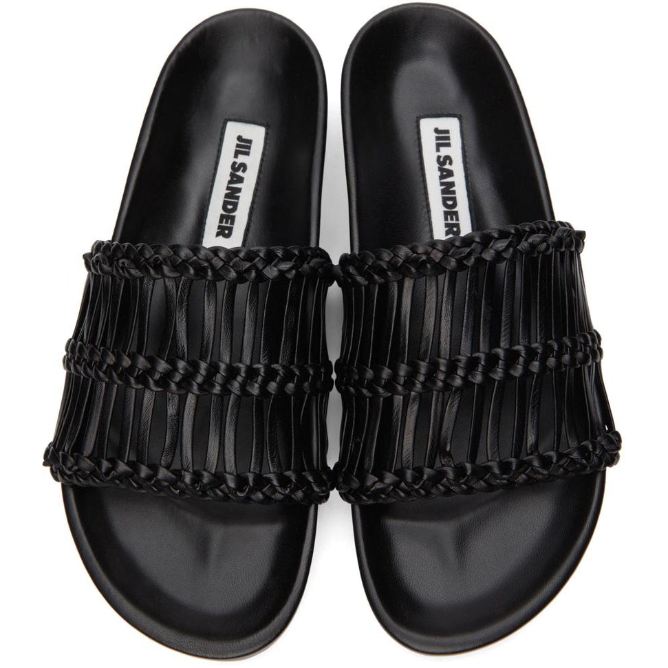 Braided leather slip-on sandals in black. Open round toe. Textile logo patch at molded buffed leather footbed. Tonal leather outsole with rubber injection at heel. Supplier color: Black Leather. Brand: Jil Sander