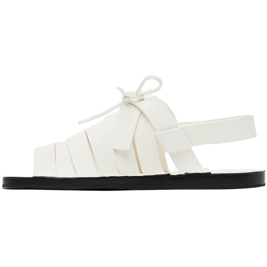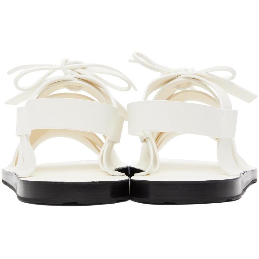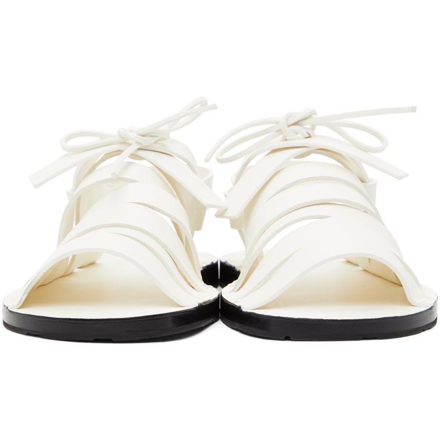 Buffed calfskin sandals in white. Open round toe. Tonal calfskin straps with self-tie fastening at vamp. Logo embossed at tonal calfskin footbed. Studs at welt. Stacked leather midsole in black. Treaded rubber outsole in black. Gold-tone hardware. Supplier color: Open white Upper: calfskin. Sole: rubber. Brand: Jil Sander