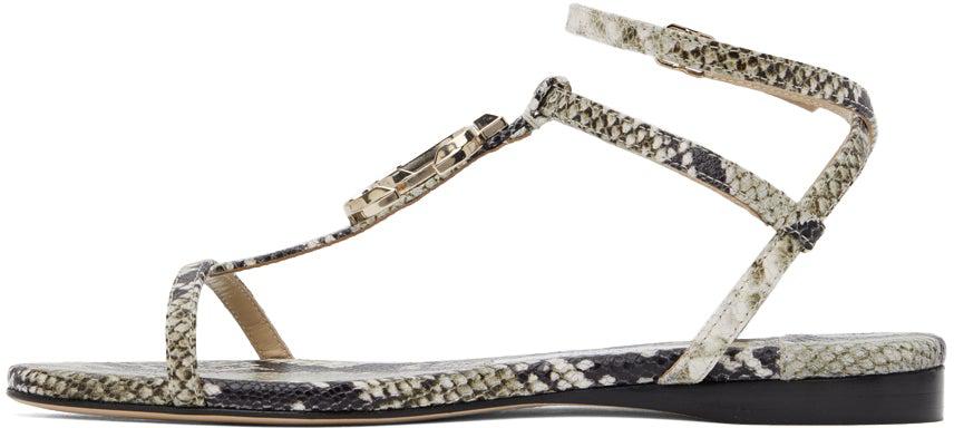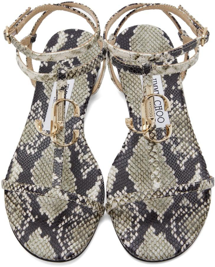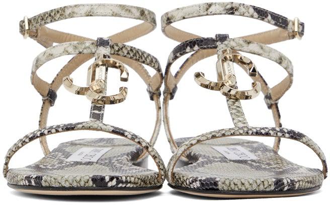 Snake-embossed leather sandals featuring graphic pattern in tones of grey, green, and black. Open round toe. Logo hardware at vamp. Adjustable wrap-around ankle strap with pin-buckle fastening. Leather midsole in black. Leather outsole in beige. Pale gold-tone hardware. Supplier color: Roccia Leather. Brand: Jimmy Choo
