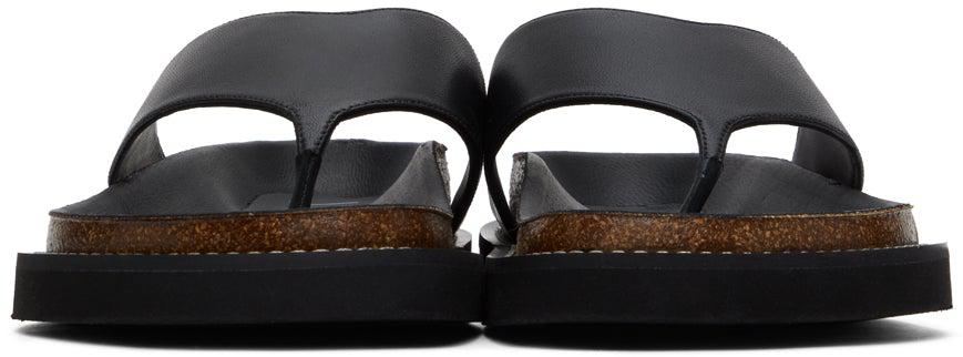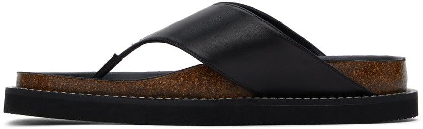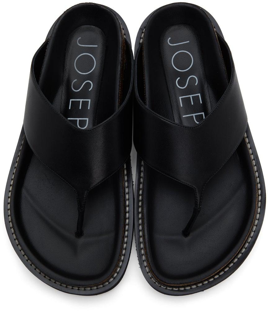 Buffed calfskin slip-on sandals in black. Open round toe. Thong-style strap at vamp. Leather logo appliqué in black and white at molded leather footbed. Topstitching in white at welt. Cork midsole. Treaded rubber outsole in black. Supplier color: Black Upper: calfskin. Sole: cork, rubber. Brand: Joseph