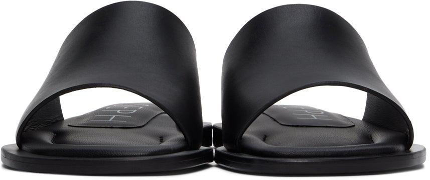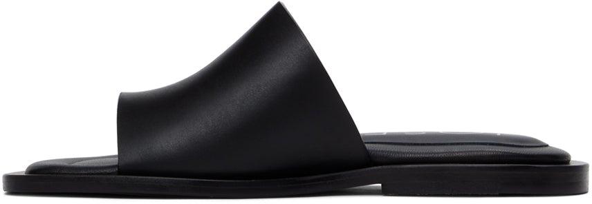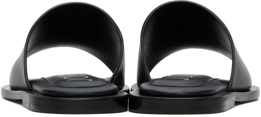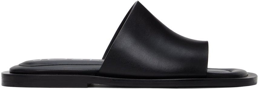 Buffed calfskin slip-on sandals in black. Open square toe. Leather logo patch in black and white at padded leather footbed. Tonal stacked leather midsole. Leather outsole in beige featuring rubber injection at heel. Supplier color: Black Upper: calfskin. Sole: leather. Brand: Joseph