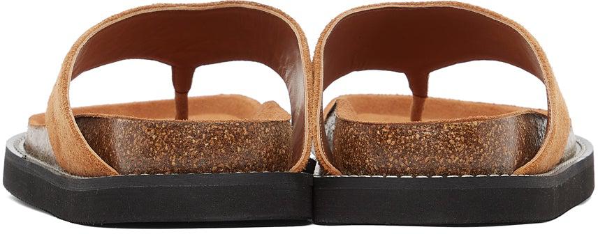 Calfskin suede sandals in brown. Thong-style strap at vamp. Leather logo patch at molded suede footbed. Topstitching in white at welt. Cork midsole. Treaded rubber outsole in black. Supplier color: Whiskey Upper: calfskin. Sole: rubber. Brand: Joseph
