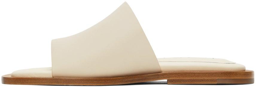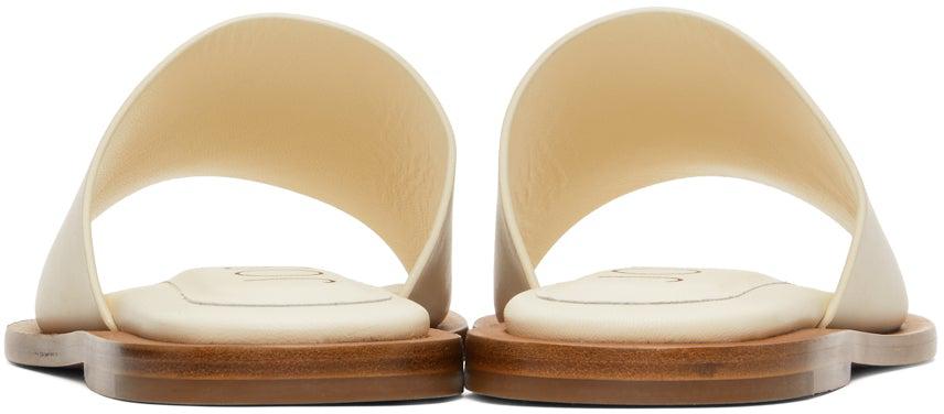 Buffed calfskin slip-on sandals in off-white. Open square toe. Leather logo patch in off-white and black at padded leather footbed. Stacked leather midsole in beige. Leather outsole in beige featuring rubber injection at heel. Supplier color: Light beige Upper: calfskin. Sole: leather. Brand: Joseph