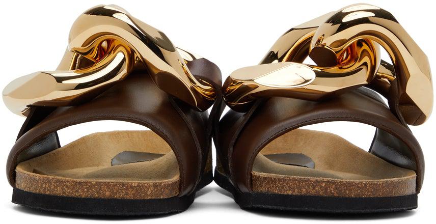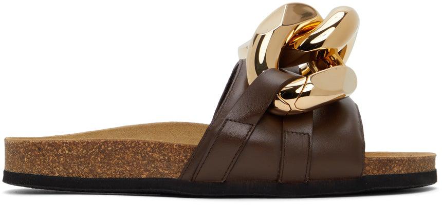 Padded buffed calfskin flat sandals in brown. Open round toe. Sculptural curb chain accent at vamp. Logo embossed at molded suede footbed. Cork midsole. Crepe rubber outsole in black. Gold-tone hardware. Supplier color: Brown Upper: calfskin. Sole: cork, rubber. Brand: JW Anderson