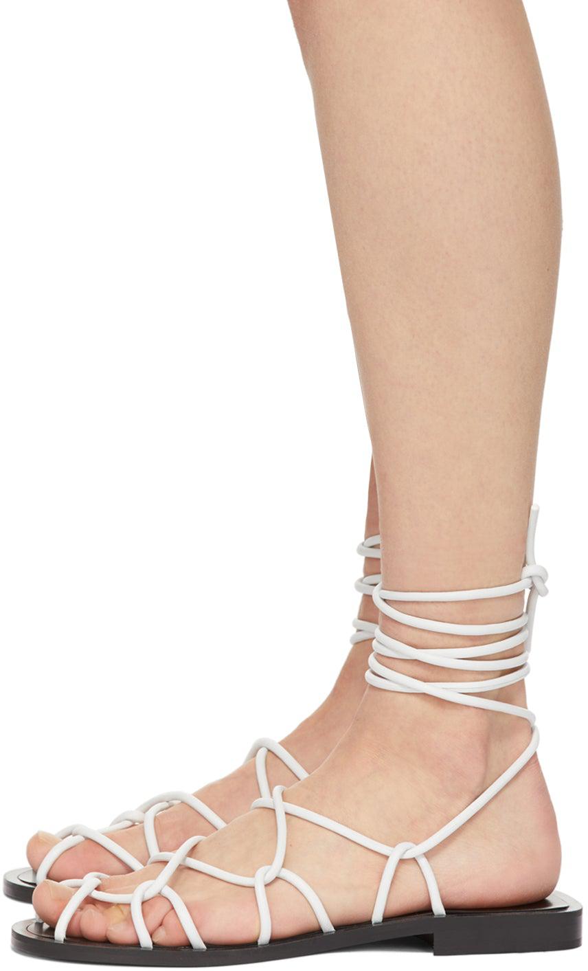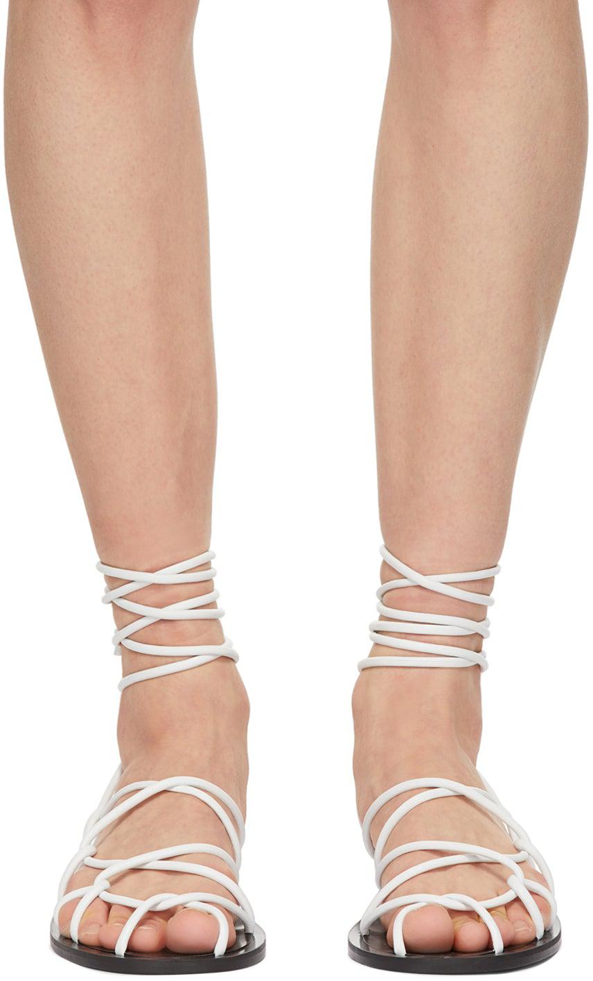 Buffed nappa lambskin sandals in white. Open round toe. Wraparound ankle straps with self-tie fastening. Embossed logo at leather footbed in black. Leather outsole in black Supplier color: White Lambskin. Brand: Khaite