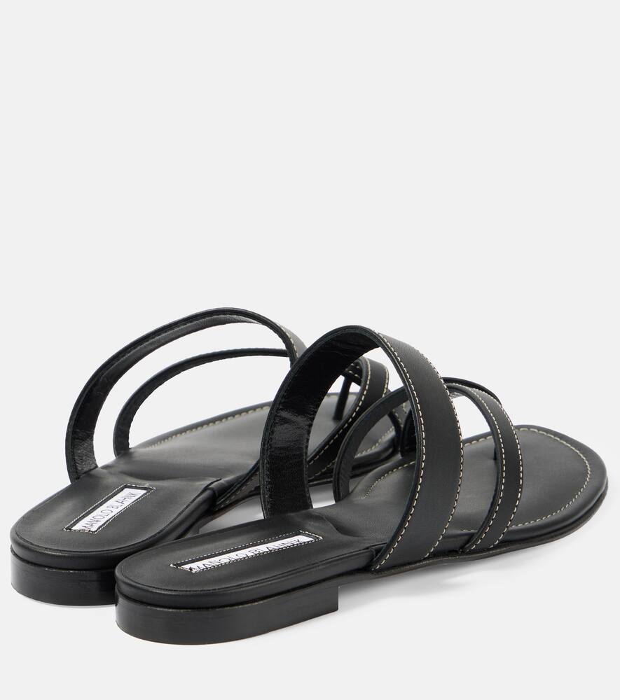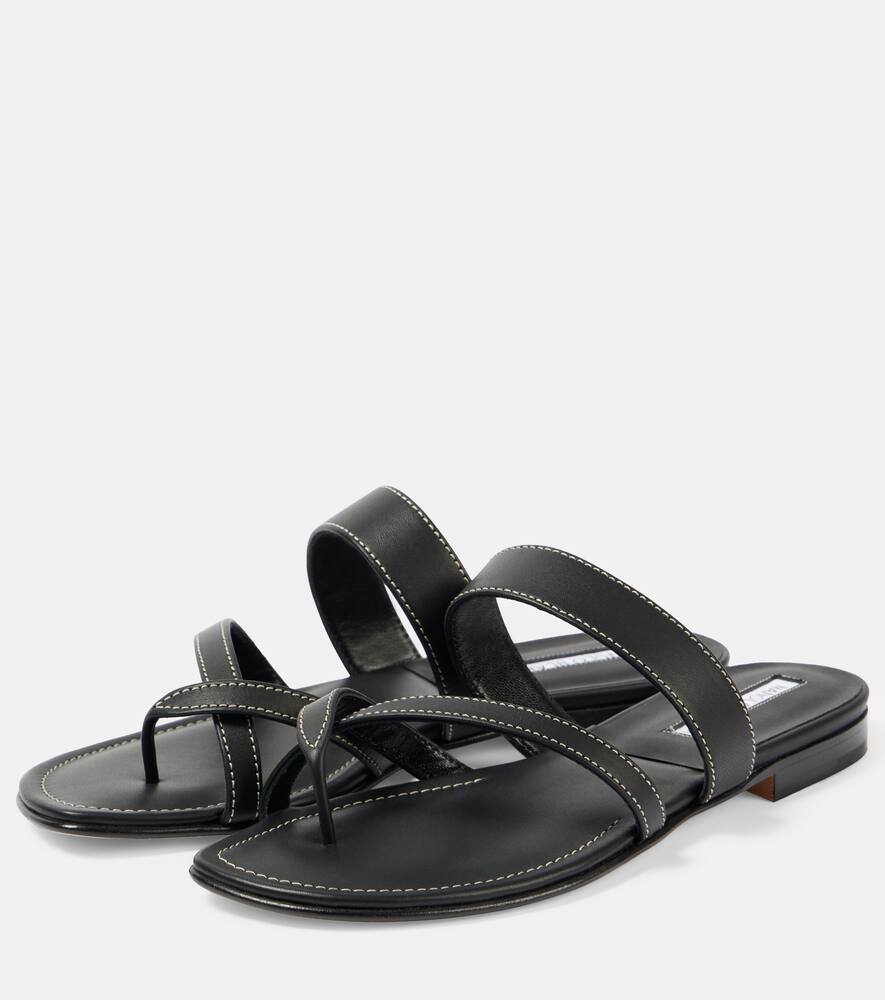 Upper: leather. Lining: leather. Sole: leather insole and sole. Toe shape: almond open toe. Made in Italy. Includes: shoe box, dust bag. Designer color name: 0015 Black. Shop the latest Manolo Blahnik Flat Sandals for women now.