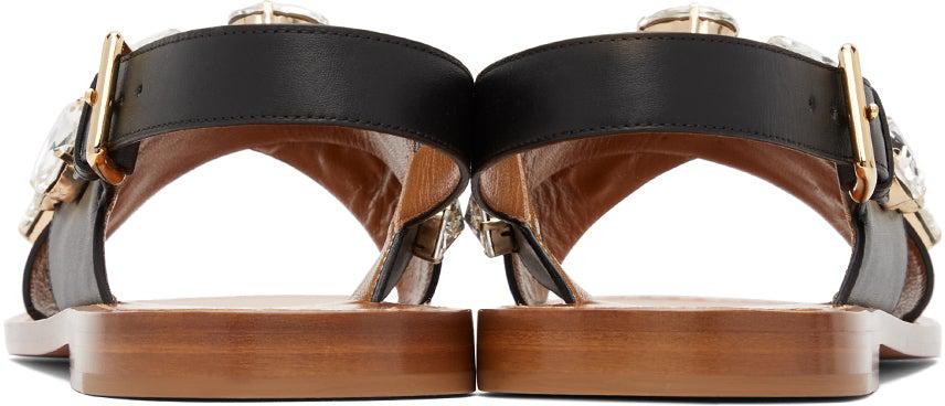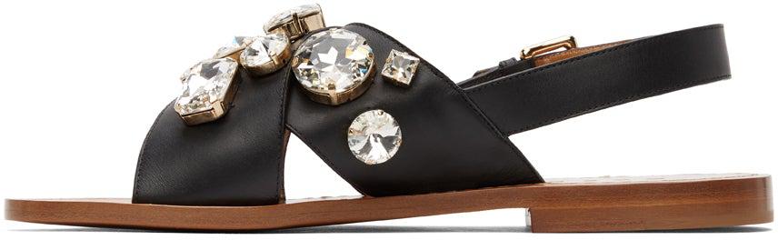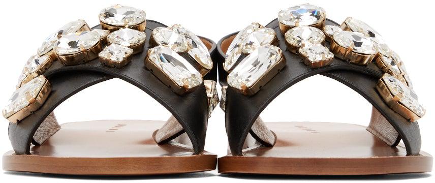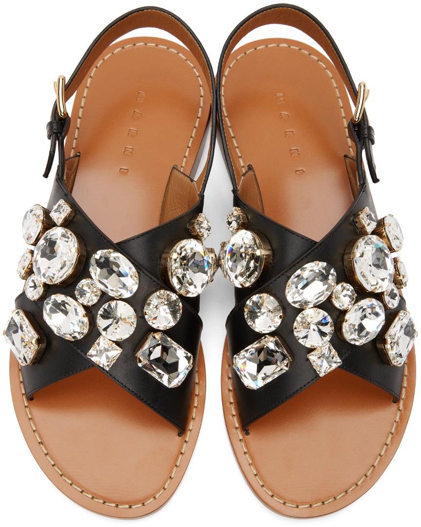 Buffed leather sandals in black. Open round toe. Criss-crossing straps featuring crystal cut appliqués at vamp. Adjustable slingback strap with pin-buckle fastening. Logo embossed at tan leather footbed. Tan leather sole featuring rubber injection at heel. Gold and silver-tone hardware. Supplier color: Black Upper: calfskin. Sole: leather. Brand: Marni