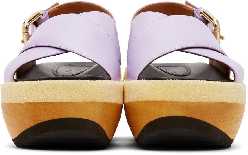 Buffed leather sandals in purple. Open round toe. Crisscrossing straps at vamp. Adjustable slingback strap with pin-buckle fastening. Logo embossed at black leather footbed. Buffed leather lining in brown. Foam rubber and wood platform midsole in yellow and tones of brown. Treaded rubber outsole in black. Gold-tone hardware. Approx. 2.5 platform. Supplier color: Lilac Upper: leather. Sole: rubber, wood. Brand: Marni