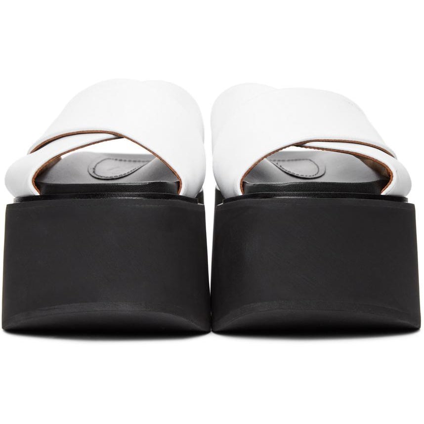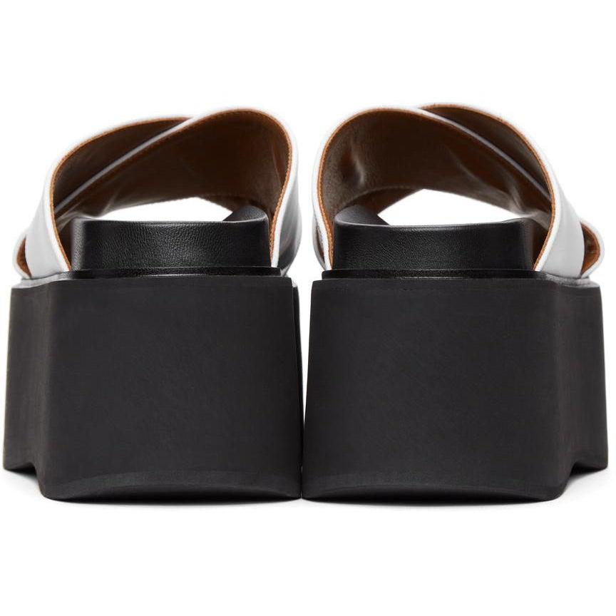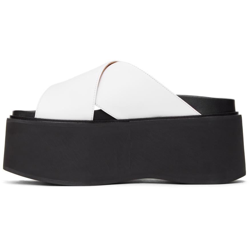Buffed calfskin slip-on sandals in white. Open round toe. Embossed logo and criss-crossing straps at vamp. Logo embossed at black molded leather footbed. Rubber platform sole in black. Approx. 3.5 platform. Supplier color: White Upper: calfskin. Sole: rubber. Brand: Marni