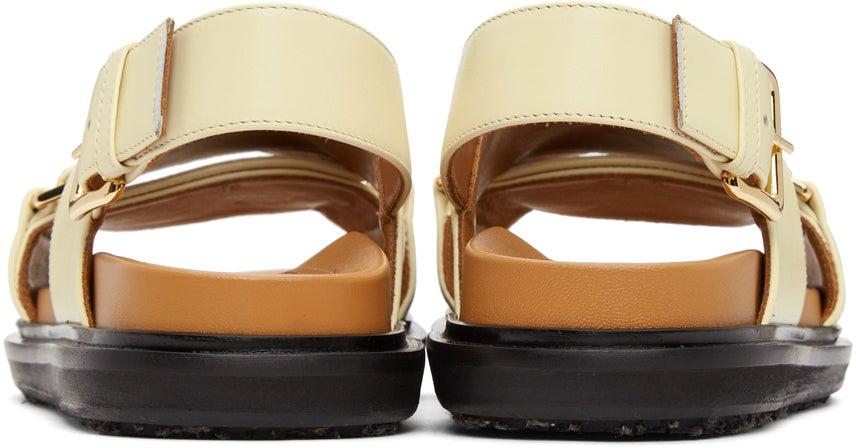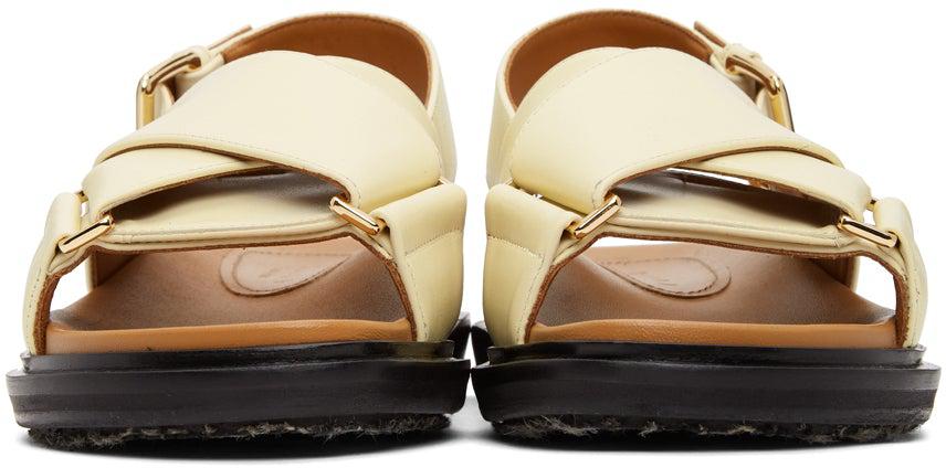 Buffed calfskin sandals in yellow. Open round toe. Criss-crossing straps at vamp. Adjustable slingback strap with pin-buckle fastening. Logo embossed at molded leather footbed in tan. Treaded rubber outsole in black featuring jute detailing in beige. Gold-tone hardware. Supplier color: Light yellow Upper: calfskin. Sole: rubber. Brand: Marni