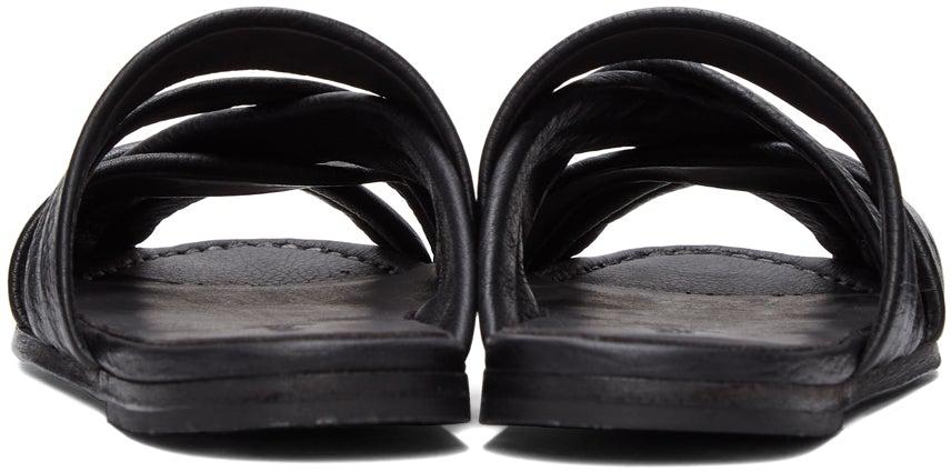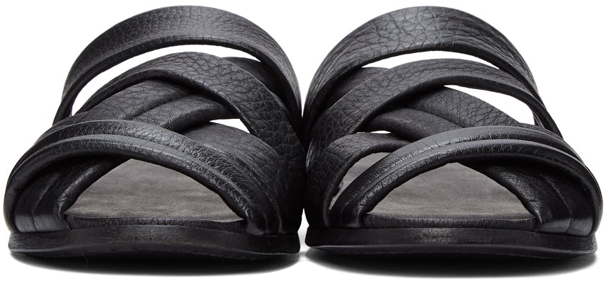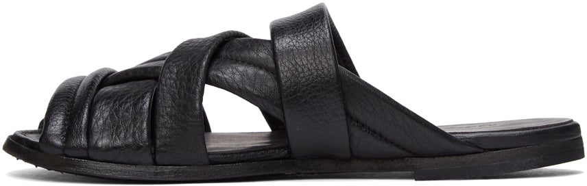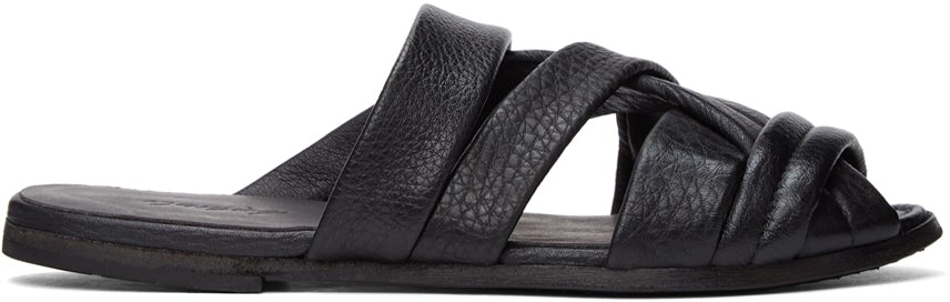 Grained calfskin slip-on sandals in black. Open round toe. Criss-crossing straps at vamp. Logo embossed at tonal padded leather footbed. Tonal leather sole with rubber injection at heel. Supplier color: Black Upper: calfskin. Sole: calfskin, rubber. Brand: Marsèll
