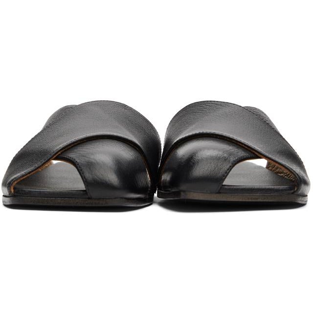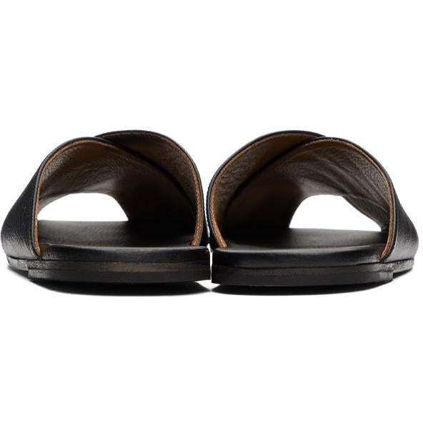 Grained calfskin slip-on sandals in black. Open square toe. Criss-crossing straps at vamp. Logo embossed at tonal leather footbed. Tonal leather sole. Supplier color: Sea Calfskin. Brand: Marsèll