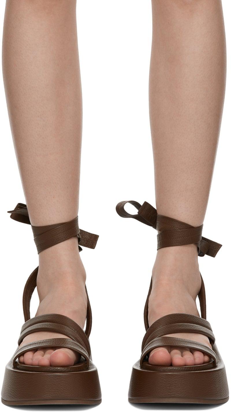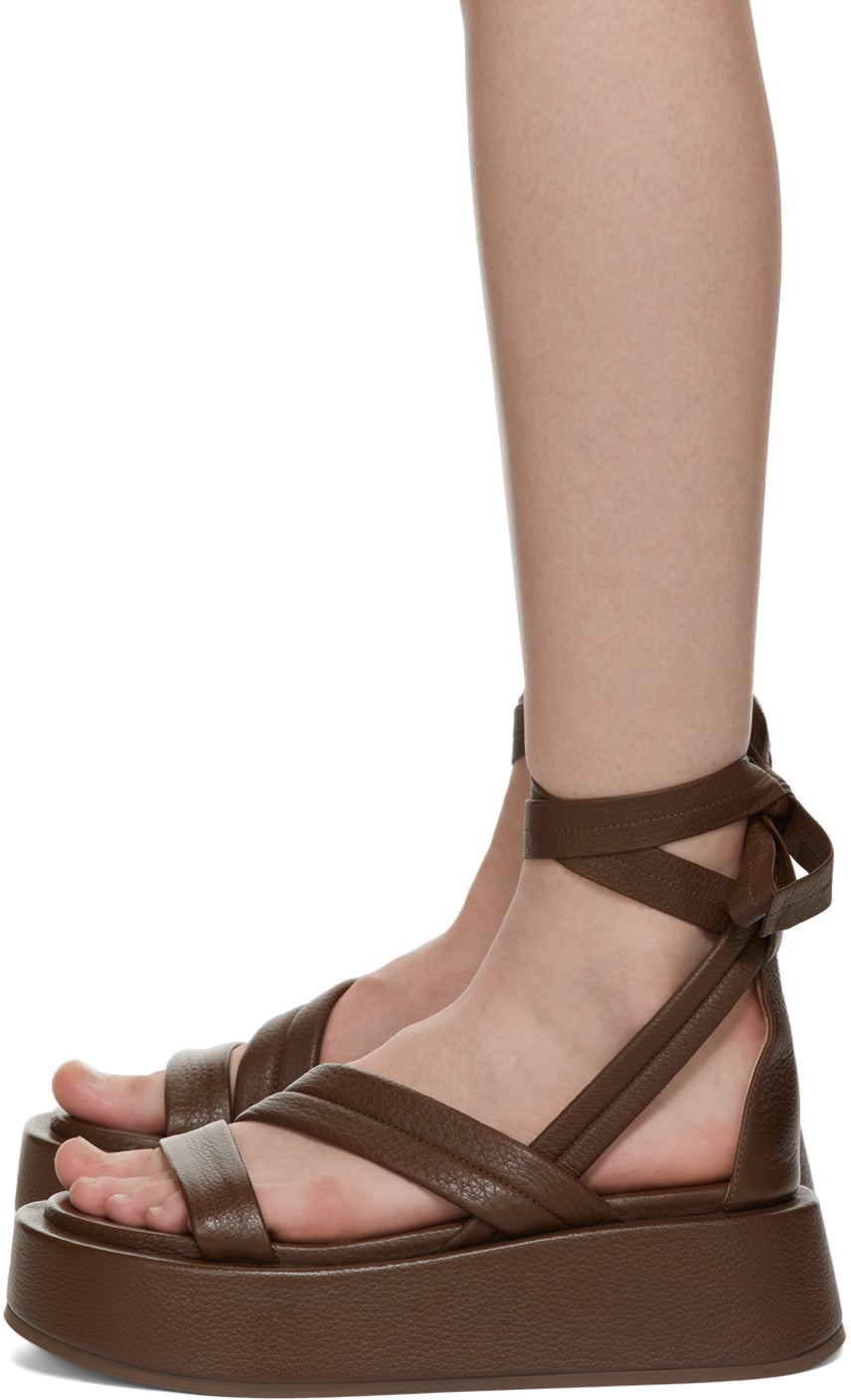 Buffed calfskin platform sandals in brown. Open round toe. Tonal straps at vamp. Self-tie straps at ankle. Embossed logo at padded leather footbed. Tonal rubber outsole. Approx. 2 platform. Supplier color: Chocolate Upper: leather. Sole: rubber. Brand: Marsèll
