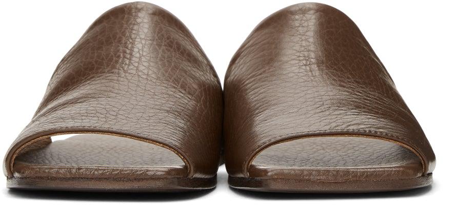 Grained leather slip-on sandals in brown. Open square toe. Logo embossed at padded leather footbed. Tonal treaded rubber heel. Tonal leather sole. Supplier color: Chocolate Leather. Brand: Marsèll
