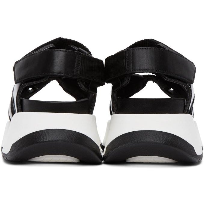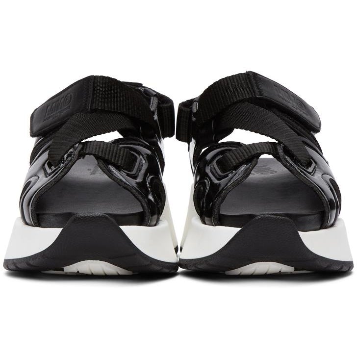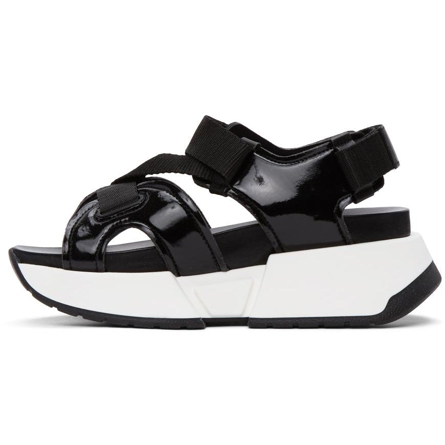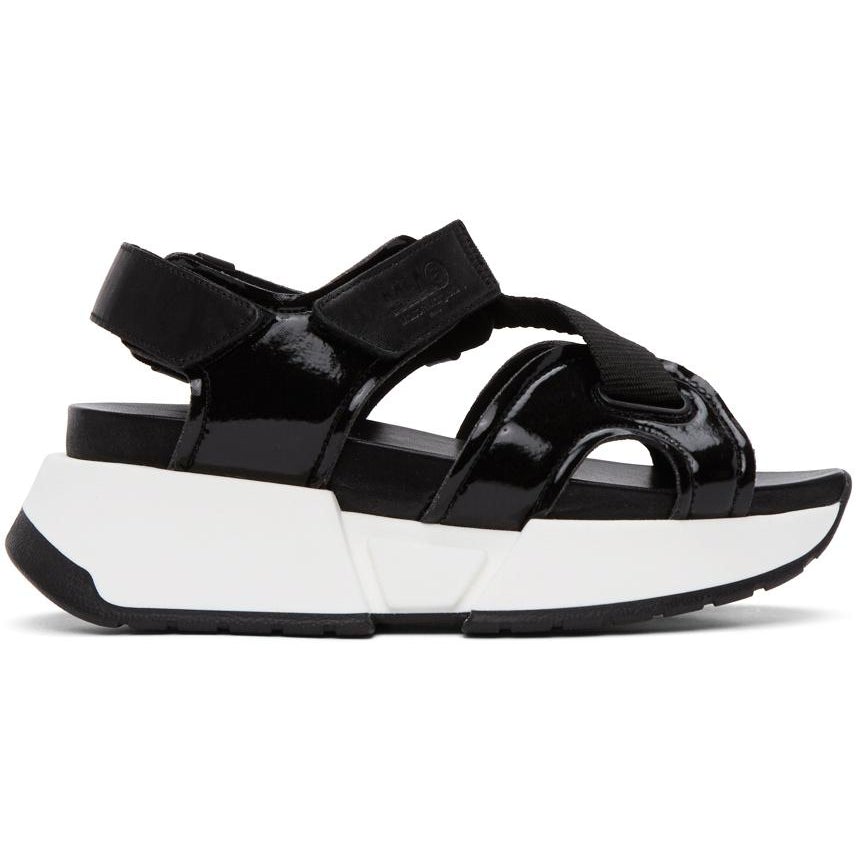 Patent leather flat sandals in black. Open almond toe. Adjustable webbing and buffed leather logo-embossed Velcro straps at vamp and ankle. Embossed logo at buffed leather footbed. Foam rubber platform midsole in white. Tonal treaded rubber outsole. Approx. 1.75 platform. Supplier color: Black Upper: leather, textile. Sole: rubber. Brand: MM6 Maison Margiela