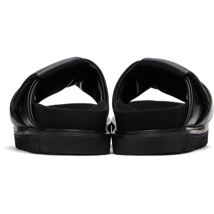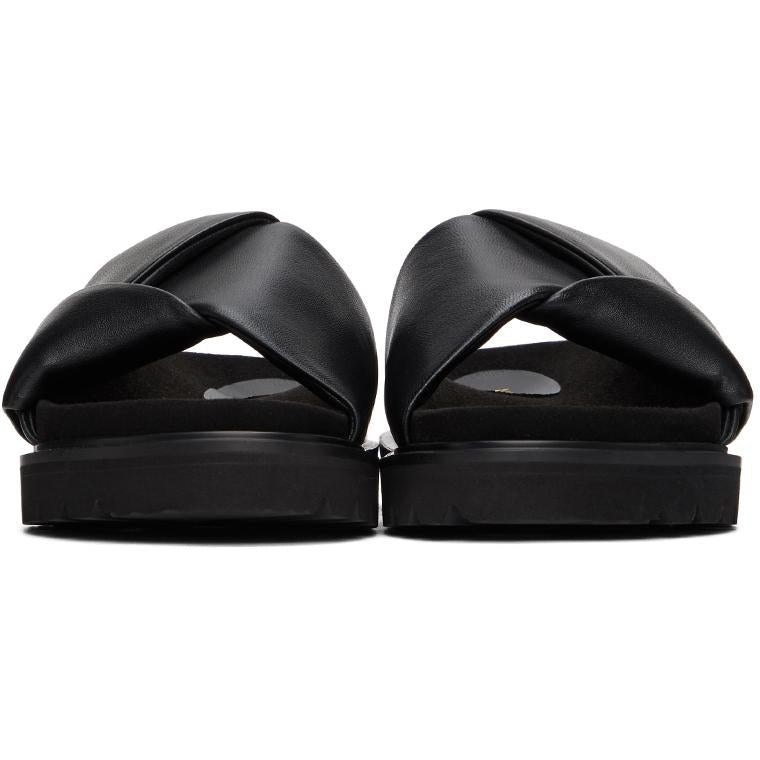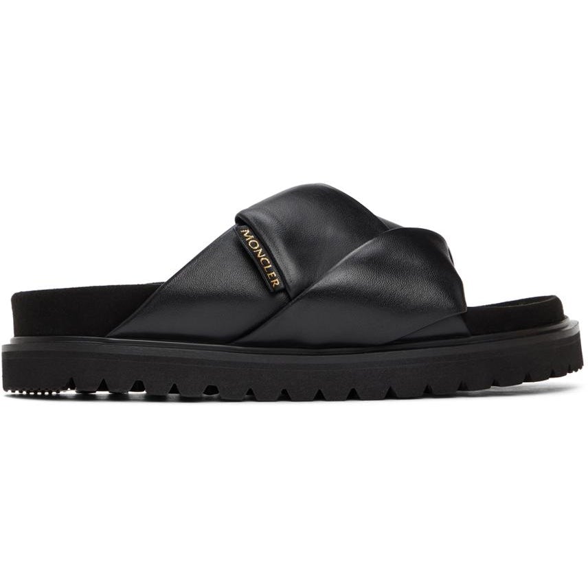 Padded and braided grained leather slip-on sandals in black. Open round toe. Leather flag with gold-tone logo stamp at vamp. Logo embossed in gold-tone at tonal molded suede footbed. Tonal treaded foam rubber sole. Supplier color: Black Upper: leather. Sole: rubber. Brand: Moncler