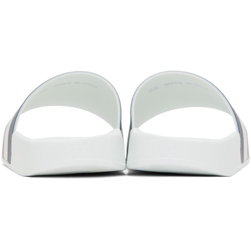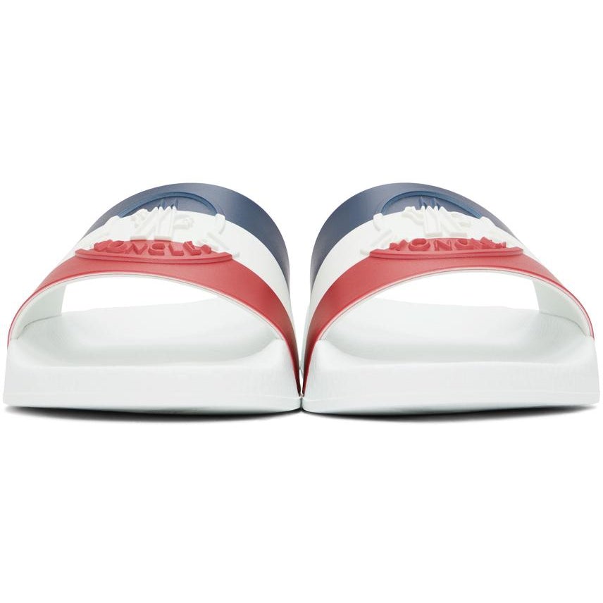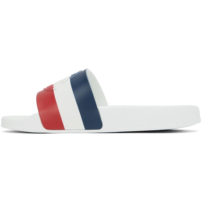 Rubber slip-on sandals striped in white, red, and navy. Open round toe. Embossed logo at strap. Molded rubber footbed in white. Treaded rubber sole in white. Supplier color: White Rubber. Brand: Moncler