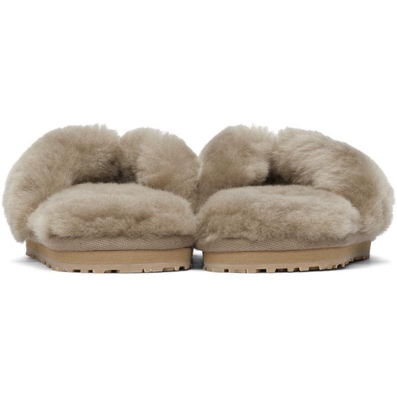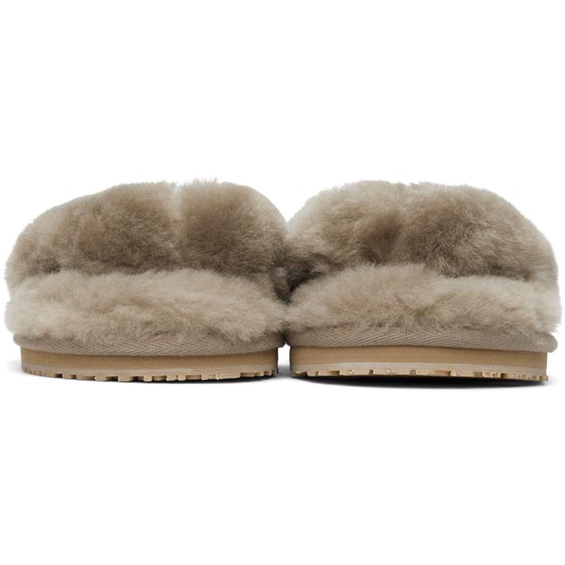 Wool fleece slip-on sandals in taupe. Open round toe. Tonal textile logo patch at footbed. Treaded EVA rubber sole in beige. Available exclusively at SSENSE. Supplier color: Elephant grey Upper: sheepskin. Sole: rubber. Brand: Mou