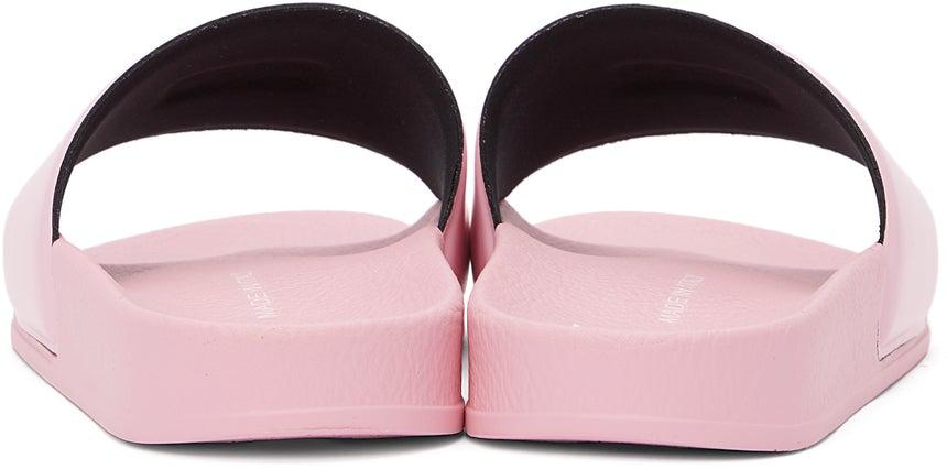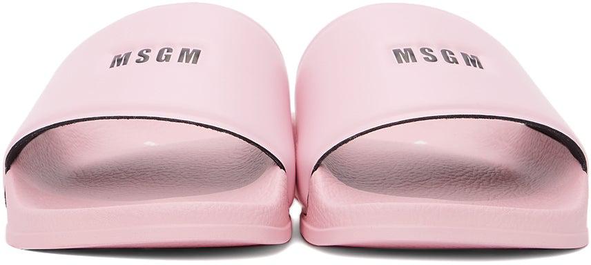 Rubber slip-on sandals in pink. Open round toe. Logo embossed in black at vamp. Logo printed in white at molded foam rubber footbed. Treaded foam rubber sole. Supplier color: Pink Rubber. Brand: MSGM