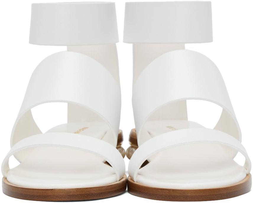 Buffed calfskin sandals in white. Open round toe. Straps at vamp. Wraparound ankle strap with adjustable press-stud fastening. Signature faux-pearls at block heel. Leather and rubber sole in tan. Gold-tone hardware. Approx. 1.25 heel. Supplier color: White Upper: calfskin. Sole: leather, rubber. Brand: Nicholas Kirkwood