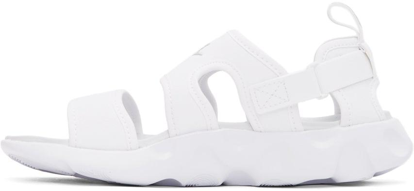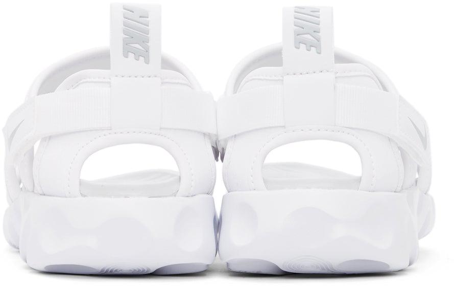 Grained faux-leather sandals in white. Open round toe. Bonded logo in grey at vamp. Adjustable ankle strap with Velcro fastening. Tonal pull-loop with bonded logo in grey at heel tab. Textured rubber footbed in light grey. Foam rubber midsole in white. Treaded rubber outsole in white. Supplier color: White/Pure platinum Upper: synthetic. Sole: rubber. Brand: Nike