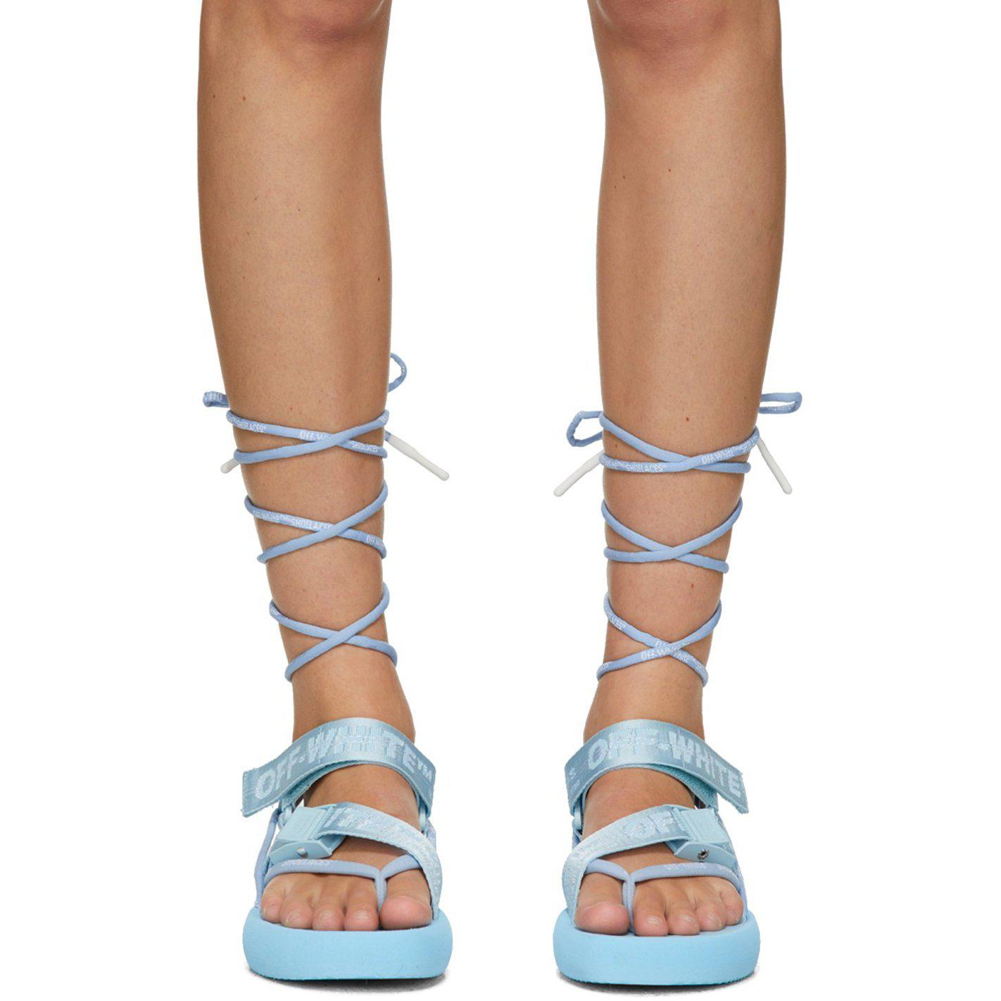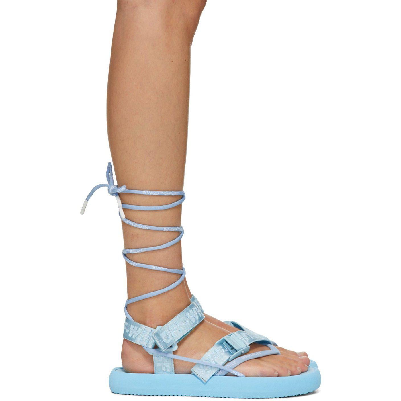 Textile webbing flat sandals in blue. Open round toe. Tonal wraparound lace-up closure featuring logo woven in white. Adjustable logo webbing straps featuring cinch fastening and Velcro fastening at vamp. Logo embossed at tonal foam rubber footbed. Tonal textured foam rubber midsole. Tonal treaded rubber outsole. Black hardware. Supplier color: Baby blue Upper: textile. Sole: rubber. Brand: Off-White
