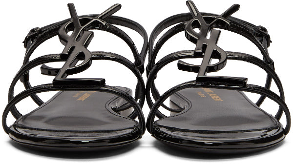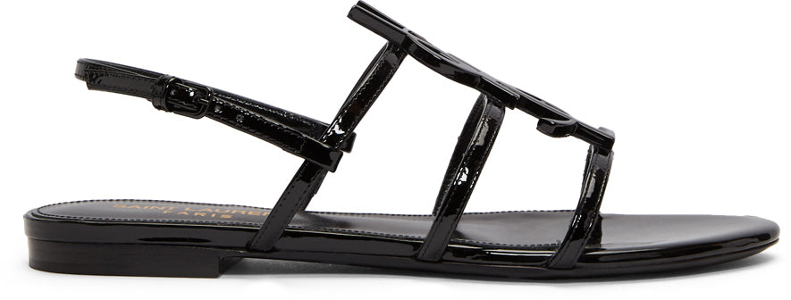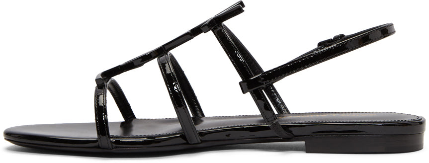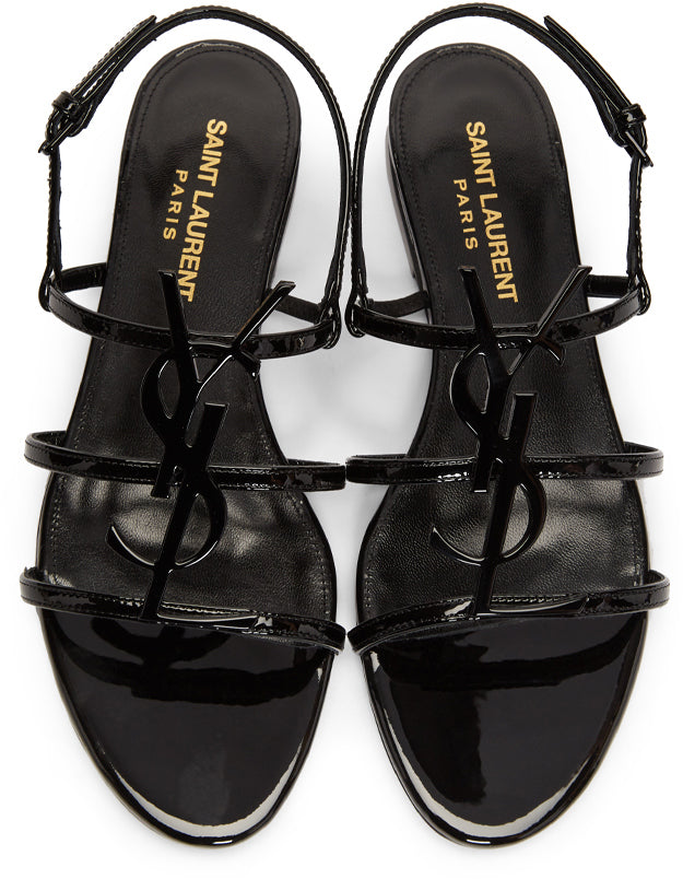 Patent calfskin sandals in black. Open round toe. Logo hardware at vamp. Adjustable slingback strap with pin-buckle fastening. Tonal leather sole with rubber injection at heel. Tonal hardware. Supplier color: Black Upper: calfskin. Sole: leather. Brand: Saint Laurent