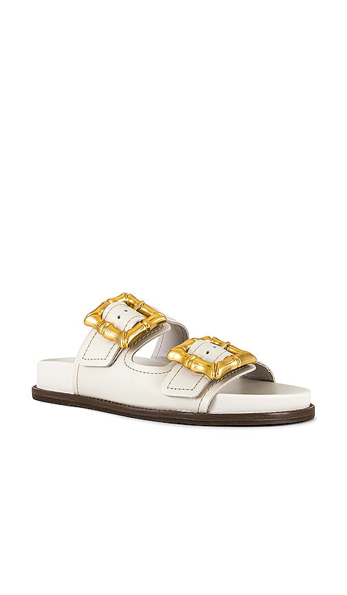 Leather upper with rubber sole. Made in Brazil. Slip-on styling. Contoured leather footbed. Leather lining. Dual gold-tone bamboo style buckles. SCHU-WZ1292. S2156400230002. Founded in 1995 by Alexandre Birman, Schutz has redefined attainable luxury, trend-forward footwear. With each new release, Schutz delivers the most of-the-moment collections that are the hero pieces around which entire outfits are built. Defined by confident, bold, and purpose-driven attitude, Schutz shoes lead the conversation, delivering fashion at your feet, one head-turning pair at a time. In her Schutz, she can conquer anything Color: Pearl. Shop Pearl Flat Sandals for women and the latest Schutz shoes now.