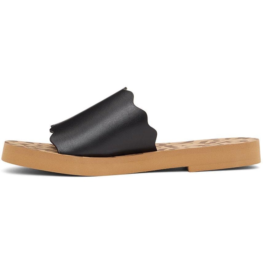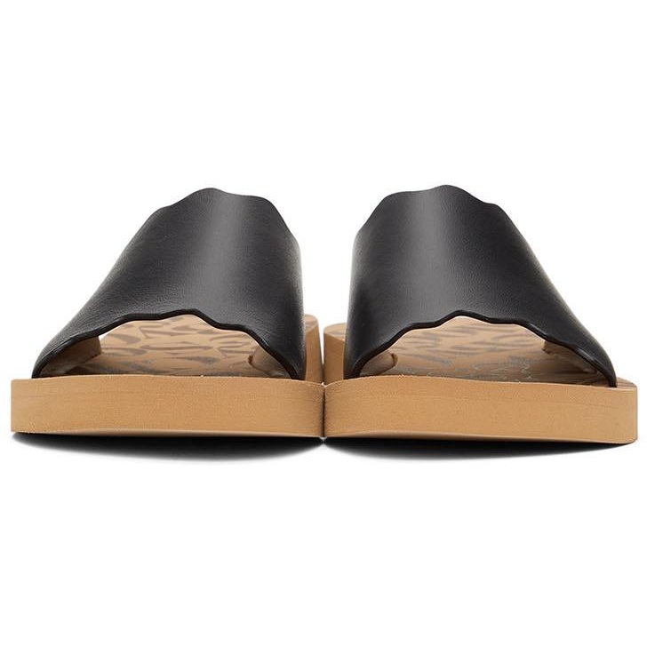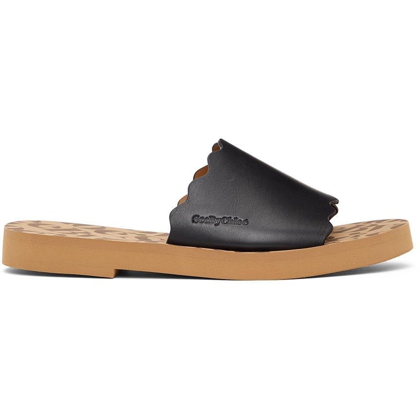 Buffed calfskin slip-on sandals in black. Open round toe. Strap at vamp featuring scalloped edges and embossed logo. Rubber footbed in tan featuring logo pattern printed in brown throughout. Rubber sole in tan. Supplier color: Black Upper: calfskin. Sole: rubber. Brand: See by Chloé