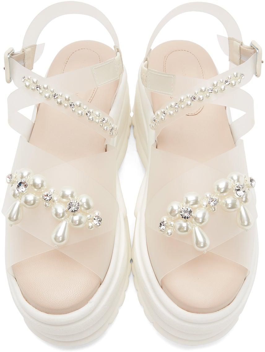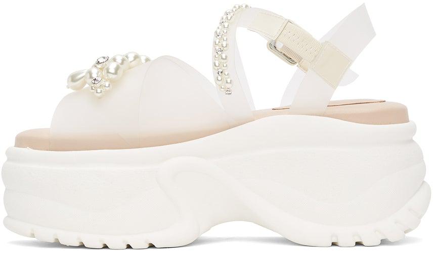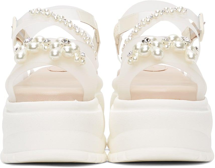 Transparent PVC sandals featuring faux-pearl and crystal-cut detailing throughout. Criss-crossing straps at vamp. Adjustable criss-crossing partially-elasticized ankle straps with pin-buckle fastening. Logo embossed at pink padded grained leather footbed. Platform rubber midsole in white. Treaded rubber outsole in white. Approx. 3 platform. Supplier color: Clear/Pearl/Clear Upper: polyvinyl chloride. Sole: rubber. Brand: Simone Rocha