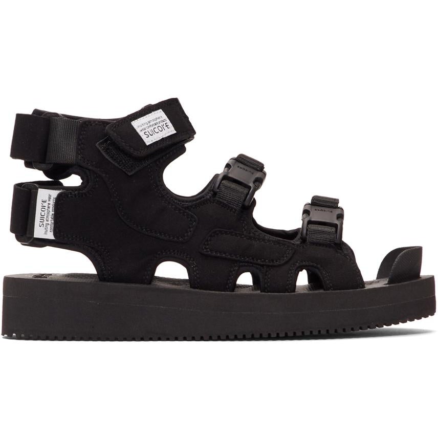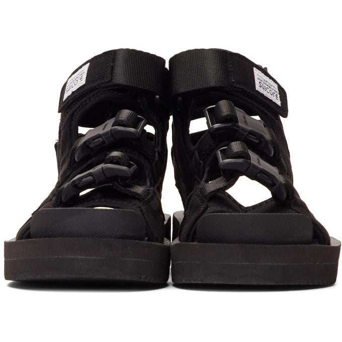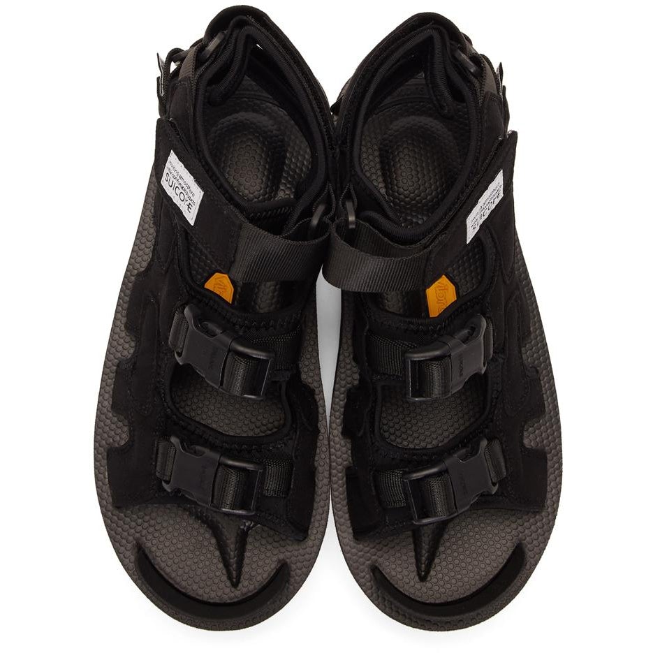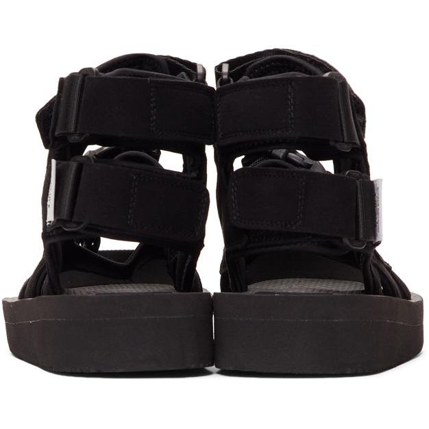Nylon and faux-suede sandals in black. Tonal rubber toe guard at open round toe. Adjustable straps with press-release fastening at vamp. Velcro cinch strap at ankle. Velcro cinch straps at heel. Textile logo patches at outer side. Molded Vibram® footbed. Tonal treaded Vibram® rubber sole. Tonal hardware. Supplier color: Black Upper: textile, synthetic. Sole: rubber. Brand: Suicoke
