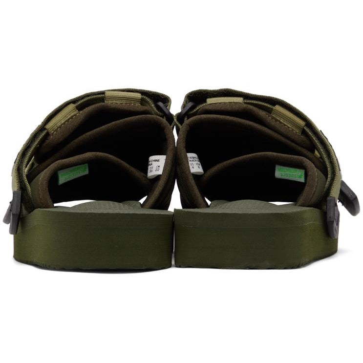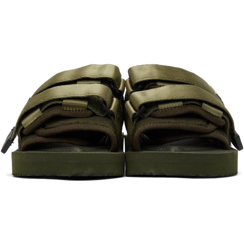 Padded bonded nylon jersey slip-on sandals in khaki. Open round toe. Twin adjustable webbing Velcro straps and logo patch in white at vamp. Tonal logo-embossed molded EVA rubber footbed. Tonal treaded rubber sole. Black hardware. Supplier color: Olive Upper: textile. Sole: rubber. Brand: Suicoke